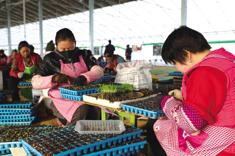 合作社工作人員正在分揀育好的蔬菜苗