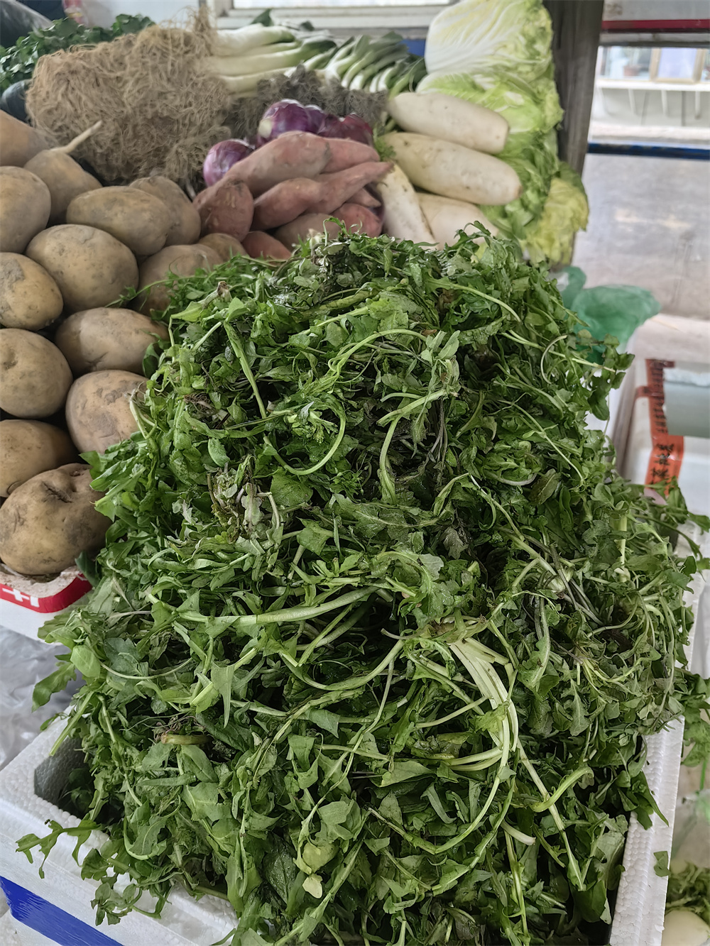 早春時節(jié),各種鮮嫩的“春菜”搶“鮮”上市。在張掖路菜市場2樓攤位上,小白菜苗、上海青等常見的葉菜擺放得整整齊齊,新鮮欲滴,吸引著眾多市民前來挑選。薺菜、兒菜、馬蹄荸薺等小眾春菜也在其中占據(jù)了一席之地,它們或被扎成小捆,或被隨意擺放,散發(fā)著質(zhì)樸的田園氣息。、